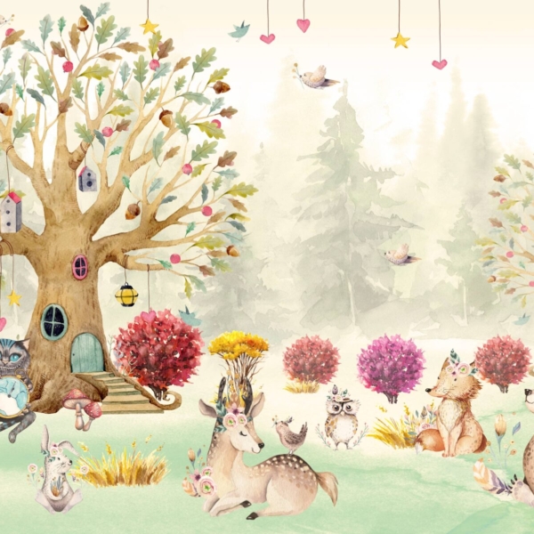- ATOGRĄŽŲ LAPAI, BERNIUKAS, Fototapetai, GYVŪNAI, Kambariui, MERGAITĖ, Rožiniai spalvos atspalviai, Rudos ir smėlio spalvos atspalviai, Spalvos, Stilius, Vaikams, Vaikiškas, VAIKUI, Žalios spalvos atspalviai