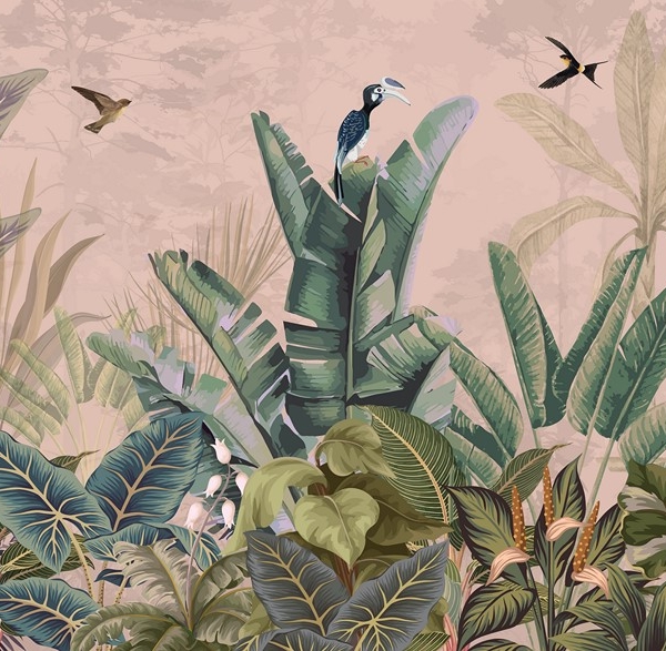 - Atogrąžų, ATOGRĄŽŲ LAPAI, Fototapetai, GYVŪNAI, Kambariui, MIEGAMAJAM, Rožiniai spalvos atspalviai, SALONUI, Spalvos, Stilius, VONIOS KAMBARIUI, Žalios spalvos atspalviai