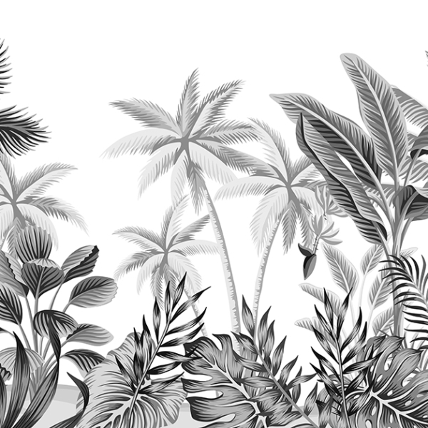 - Atogrąžų, ATOGRĄŽŲ LAPAI, Fototapetai, Kambariui, MIEGAMAJAM, Pilkos spalvos atspalviai, Spalvos, Stilius, VONIOS KAMBARIUI