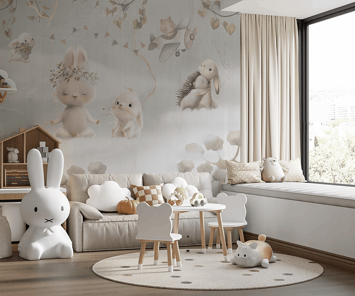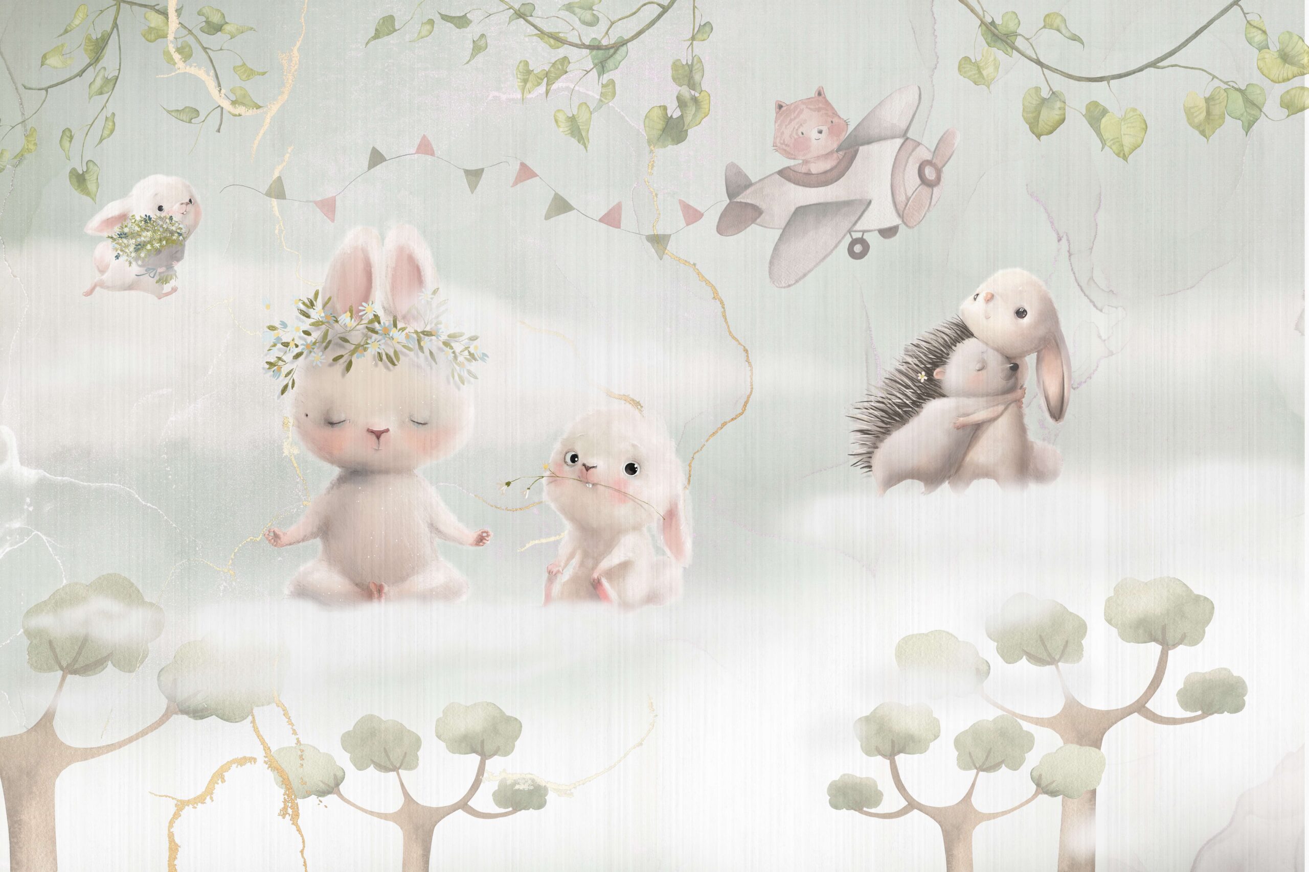 Fototapetas „Debesų mielės“ – magiškas vaiko vaizduotės pasaulis, draugiškų gyvūnų švelnumas ir šiluma