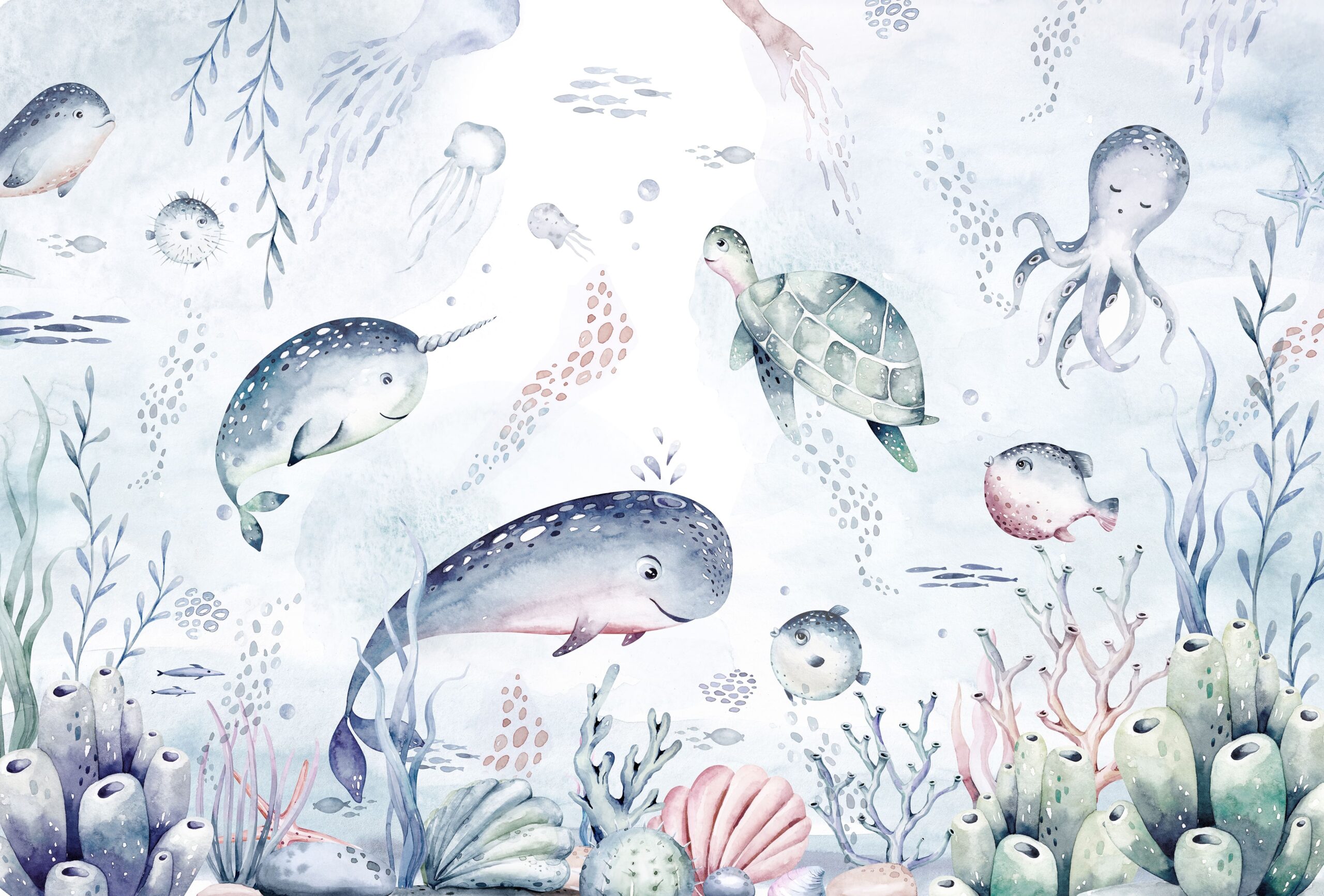 Paverskite savo vaiko kambarį užburta šalimi su fototapetu „Didžioji jūros šeima“. Šis žavus, rankomis tapytas raštas vaizduoja draugiškus vandenyno gyventojus – nuo besijuokiančio narvalo per smalsų aštuonkojį iki linksmų žuvų ir ramaus vėžlio. Visas raštas dekoruotas subtiliomis pastelinėmis spalvomis, kurios interjerui suteikia harmonijos, ramybės ir vaikiško džiaugsmo.