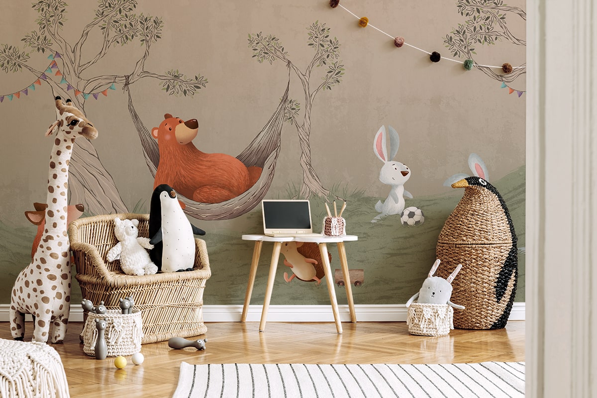 Paverskite savo vaiko kambarį žavingu kampeliu, pilnu nuotykių ir miško magijos, su fototapetu „Draugų miško nuotykiai“. Šiame subtiliame, ranka iliustruotame vaizde vaizduojami draugiški gyvūnai – meškiukas hamake, zuikučiai, žaidžiantys kamuoliu, smalsi lapė ir linksmas ežiukas – leidžiantys laiką kartu pasakų miške.
