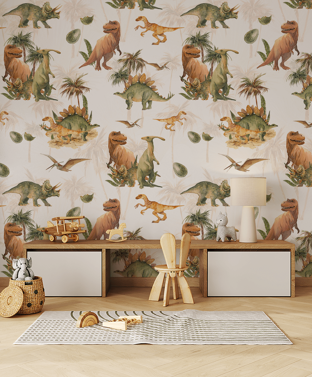 Paverskite savo vaiko kambarį žavinga nuotykių šalimi su fototapetu „Džiunglių dinozaurai“. Šis spalvingas, gyvybingas raštas nukelia jūsų mažylį į senovės džiunglių širdį, kurioje gyvena draugiški dinozaurai, egzotiški augalai ir paslaptingi dinozaurų kiaušiniai. Kiekviena detalė sukurta atsižvelgiant į vaiko vaizduotę – nuo besišypsančių tiranozaurų iki didingų stegozaurų ir skraidančių pterozaurų.