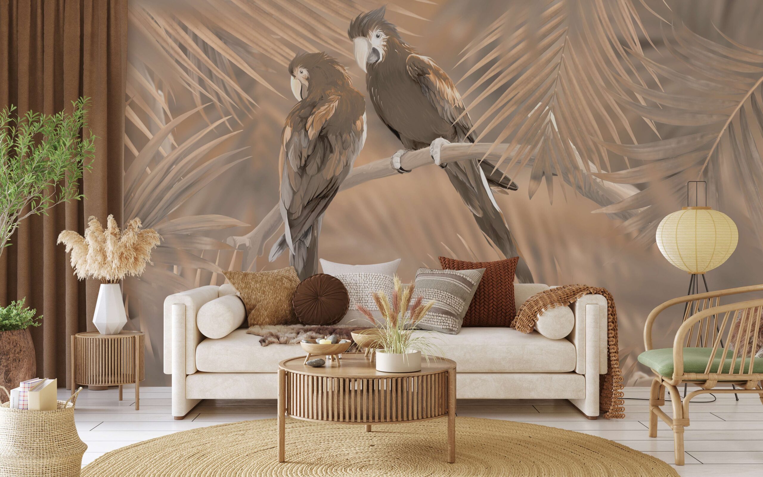 Suteikite savo interjerui egzotikos ir ramybės su fototapetu „Egzotiškas susitikimas“. Dviejų papūgų, tupinčių tarp subtilių palmių lapų, iliustracija sukuria natūralaus žavesio ir harmonijos kupiną kompoziciją. Prislopintos, smėlio ir rudos spalvos suteikia visumai kilnų, raminantį charakterį.