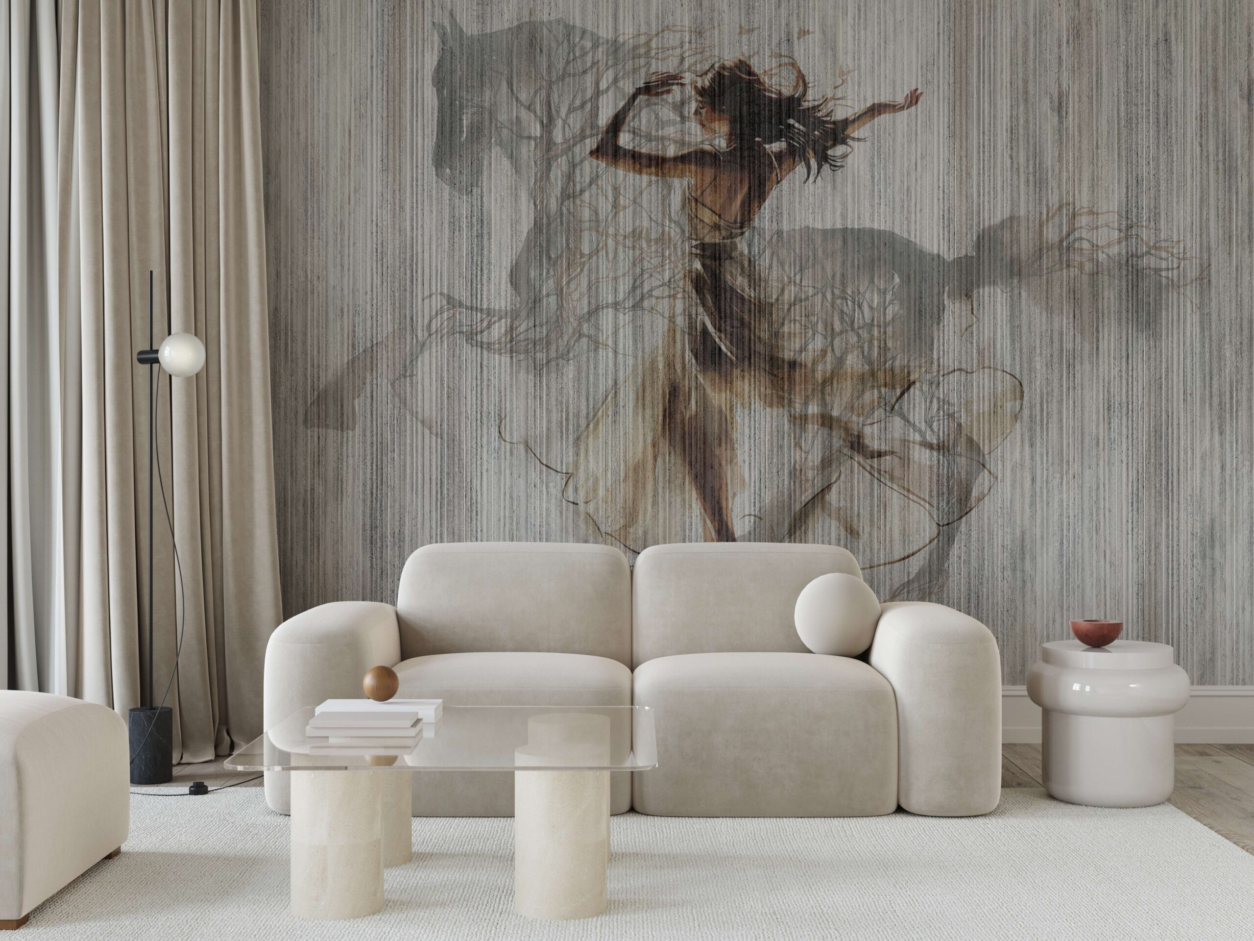 Įneškite subtilaus meno magiją į savo interjerą su fototapetu „Gamtos šokis“. Šioje unikalioje kompozicijoje derinamas šokančios ekstazės apimtas moters siluetas su subtiliu arklio kontūru ir organiniais motyvais, primenančiais medžių šakas. Visas dizainas išlaikomas prislopintomis, eterinėmis spalvomis, kurios erdvei suteikia ramybės, poezijos ir meninio gylio.