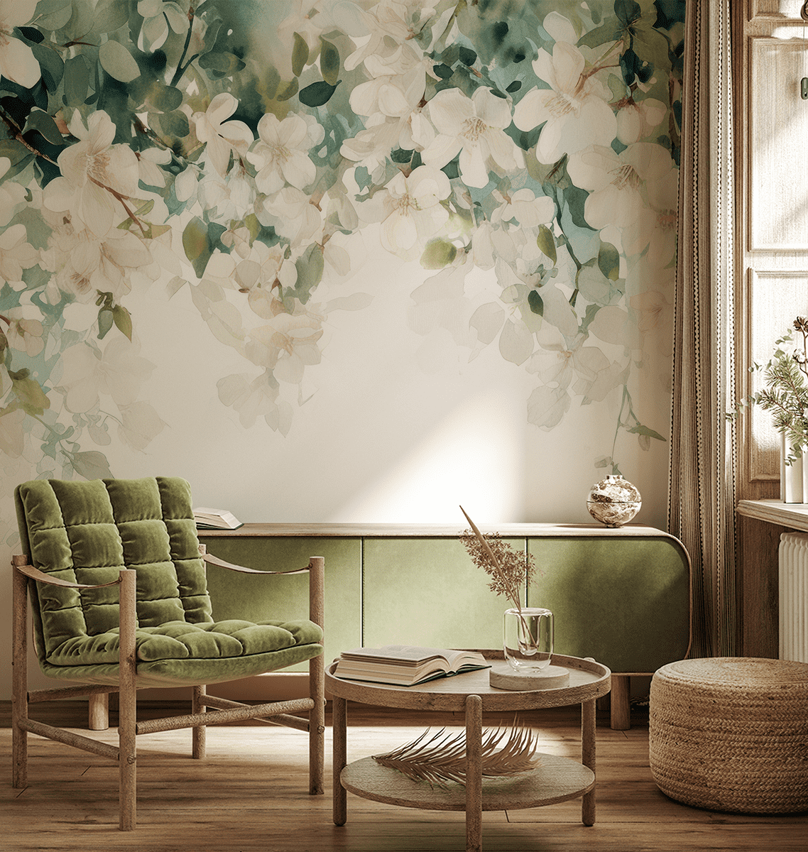 Fototapetas „Gėlių lietus“ – subtilus lengvumas, natūrali harmonija ir gaivus interjero dekoras