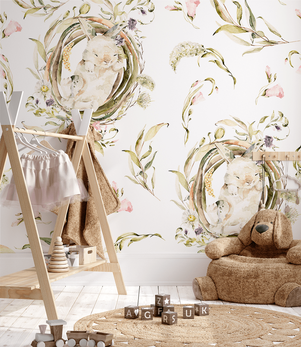 Sukurkite magišką atmosferą savo vaiko kambaryje su fototapetu „Gėlių prieglauda“. Šis žavus raštas su minkštu, miegančiu zuikučiu, apsuptu subtilių gėlių ir lapų, sukuria šiltą, jaukią, saugumo ir džiaugsmo kupiną atmosferą. Pastelinės spalvos ir pasakų motyvai puikiai dera prie vaikų interjero, įnešdami ramybės ir harmonijos.