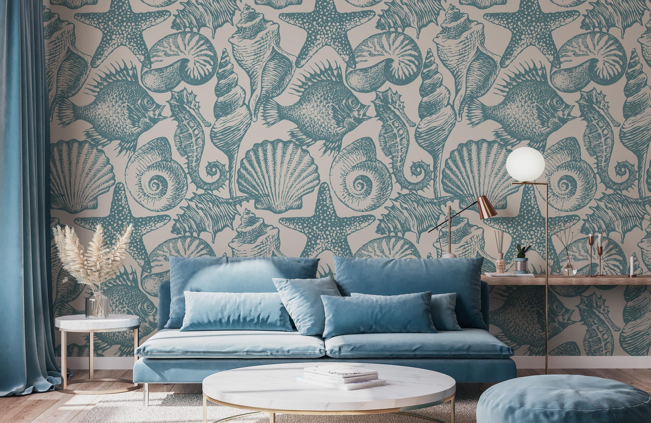 Įneškite į savo namus šiek tiek pajūrio žavesio su fototapetu „Sea Melody“. Šis subtilus, mėlynai baltas raštas, įkvėptas jūros lobių – kriauklių, žuvų, jūrų žvaigždžių ir jūrų arkliukų – suteikia erdvei ramią ir atpalaiduojančią atmosferą. Klasikinius jūrinius graviūrų raštus primenantis raštas puikiai dera prie įvairių kompozicijų – nuo modernių iki tradiciškesnių.