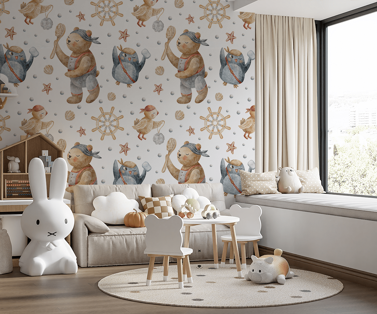 Įneškite šiek tiek fantazijos ir jūros nuotykių į savo mažylio kambarį su fototapetu „Jūros išdaigų įgula“. Šis žavus, rankomis tapytas raštas vaizduoja draugiškus piratų gyvūnus – meškiuką, pingviną ir paukštį – kurie kartu atranda povandeninį pasaulį, pilną kriauklių, jūros žvaigždžių ir vairų. Šiltos spalvos, švelnios akvarelės detalės ir draugiški personažai suteikia interjerui pasakos charakterį ir jaukumą.