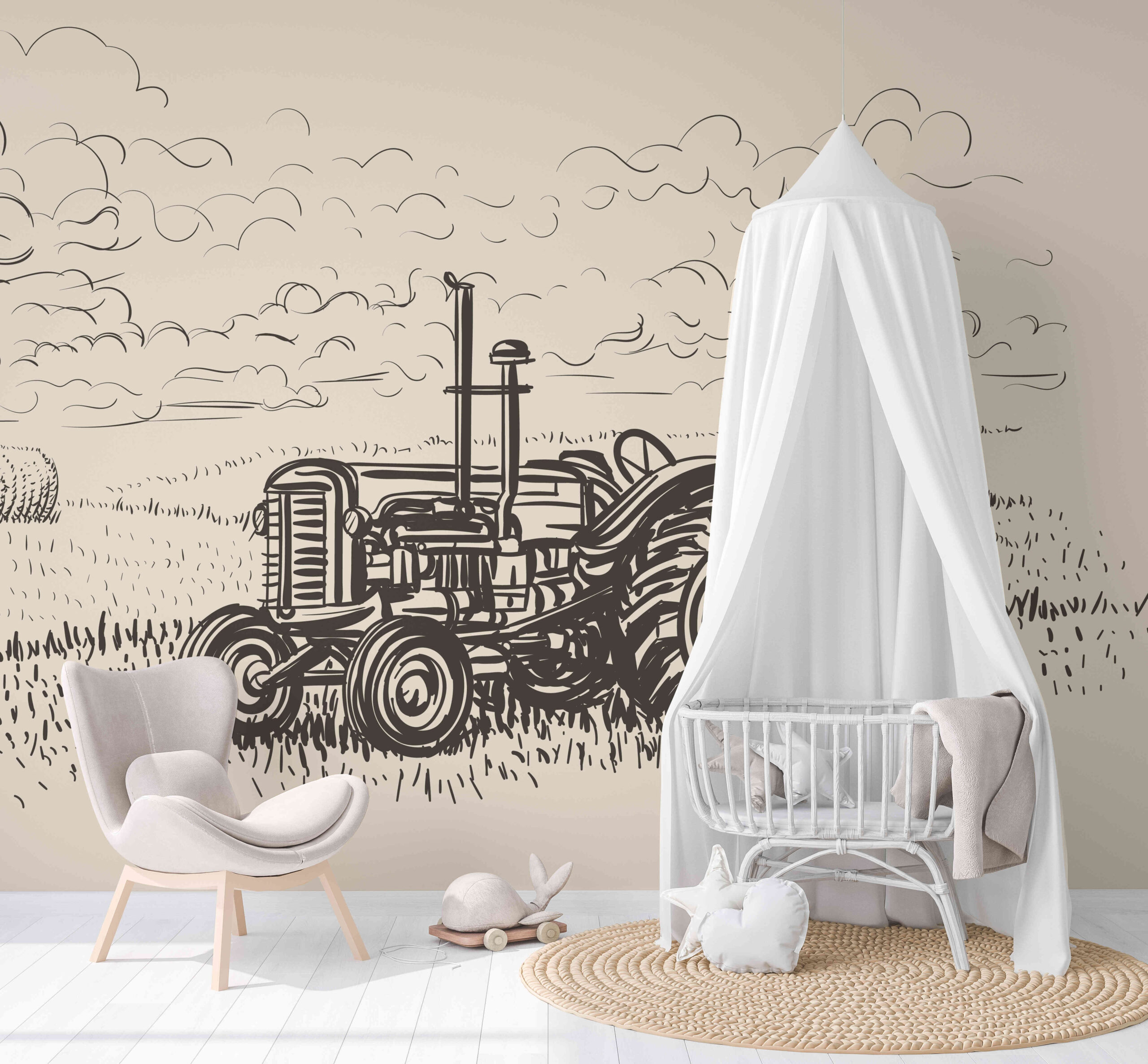 Sukurkite savo namams unikalią atmosferą su fototapetu „Kaimo nostalgija“. Šis įmantriai sukurtas traktoriaus eskizas lauko su šieno rulonais fone primena kaimo gyvenimo paprastumą ir harmoniją, suteikdamas erdvei šiltą ir jaukią atmosferą. Subtilus, monochromatinis stilius puikiai dera tiek su klasikiniu, tiek su moderniu interjero dizainu.