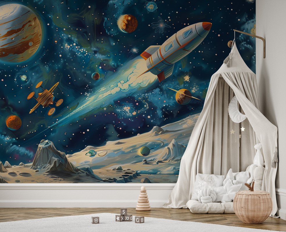 Fototapetas „Kelionė į kosmosą“ – tai dekoracija, kuri perkelia interjerą į pasakišką visatos viziją – su raketa, sklandančia tarp planetų, žvaigždžių ir ūkų intensyviose naktinio dangaus spalvose. Vaizdas, pilnas gilios juodos, ultramarino, mėlynos ir kitų akcentų, sukuria erdvinę kompoziciją, puikiai tinkančią paauglio, kūrybiniam ar vaiko kambariui. Iliustracijos stilius svyruoja tarp futuristinės mokslinės fantastikos ir meninės erdvės vizijos, todėl tapetai spinduliuoja energiją, įkvėpimą ir begalinio potencialo pojūtį.