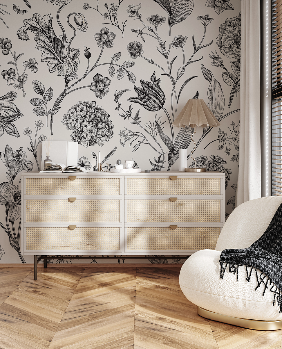 Sukurkite savo namams unikalią atmosferą su fototapetu „Klasikinis botaninis elegancija“. Šis įmantriai sukurtas, juodai baltas gėlių raštas primena klasikinių botaninių graviūrų atmosferą, suteikdamas erdvei rafinuotą ir ramią atmosferą. Subtilios detalės ir nesenstančios spalvos puikiai dera tiek prie tradicinių, tiek prie modernių kompozicijų.