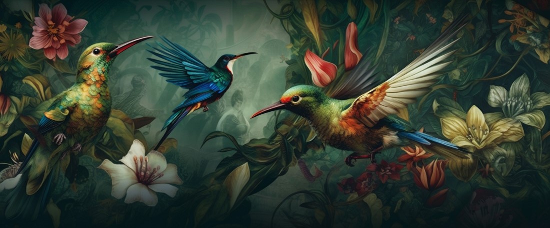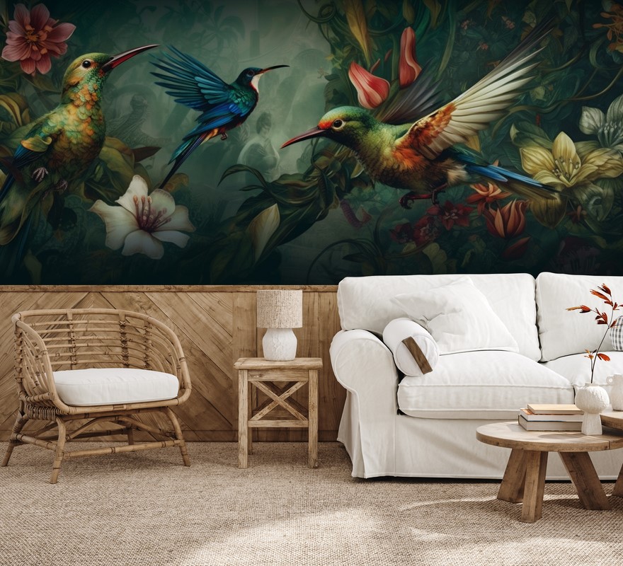 Fototapetas „Kolibrio šokis džiunglėse“ – egzotiškas lengvumas, spalvinga dinamika ir magiškas gamtos žavesys