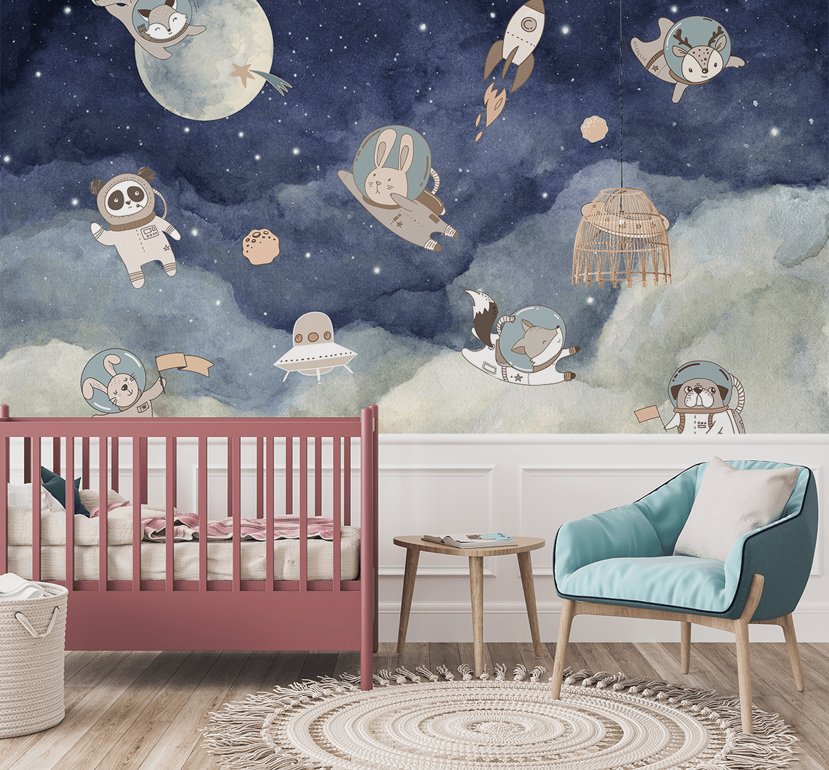 Sukurkite nuostabią atmosferą savo vaiko kambaryje su fototapetu „Kosminiai gyvūnai“. Šioje spalvingoje ir detalioje iliustracijoje pavaizduoti mieli gyvūnai su skafandrais, sklandantys tarp žvaigždžių, planetų ir raketų. Pasakų peizažai lavina vaizduotę ir skatina svajones apie keliones kosmose, sukurdami džiaugsmo ir nuotykių kupiną erdvę.