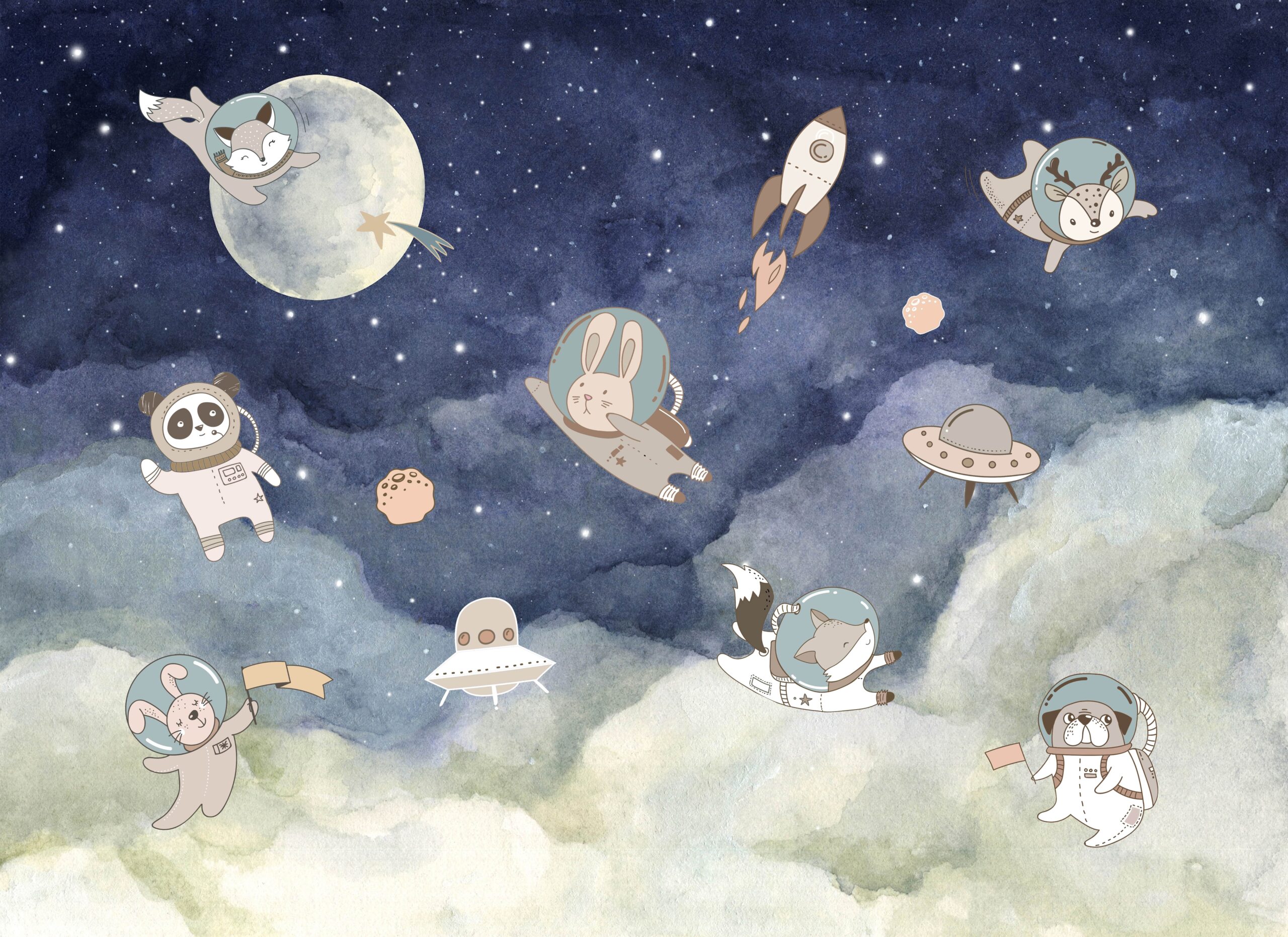 Fototapetas „Kosminiai gyvūnai“ – stebuklinga kelionė į kosmosą, kupina mielų gyvūnų ir vaiko vaizduotės