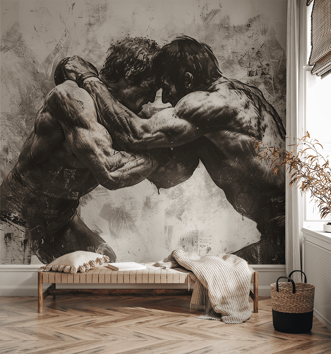 Sukurkite savo namams unikalią atmosferą su fototapetu „Kovos glėbyje“. Šis jaudinantis, juodai baltas motyvas vaizduoja du imtynininkus, vykstančius įtemptoje kovoje, spinduliuojančius jėgą, ryžtą ir aistrą. Išraiškinga kompozicija, įkvėpta klasikinių sporto eskizų, pabrėžia žmogaus kūno galią ir kovos dvasią, sukurdama unikalų akcentą bet kurioje erdvėje.