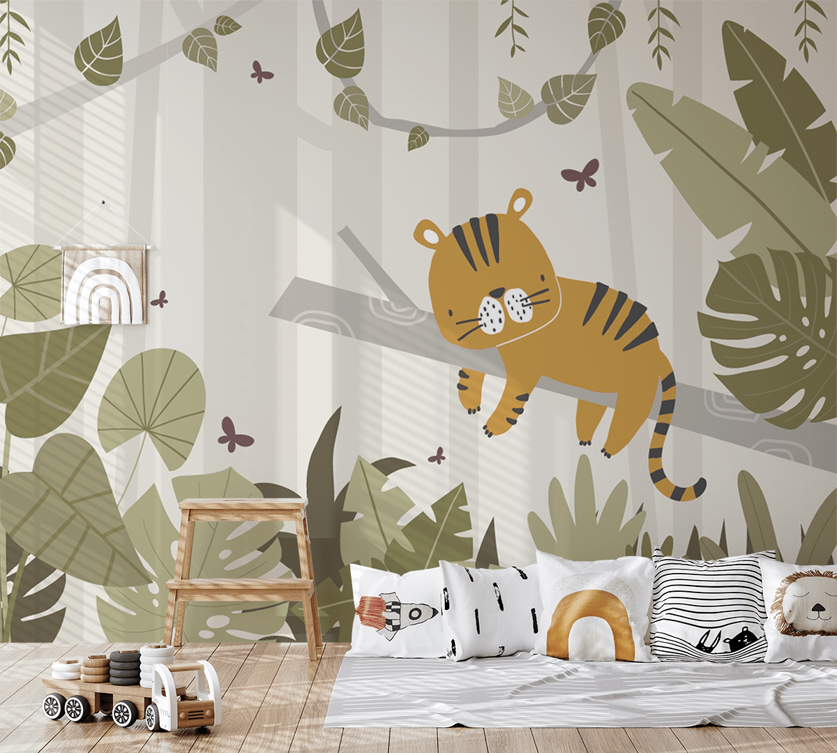 Įneškite magišką pasaulį į savo vaiko kambarį su fototapetu „Mažasis tigriukas žaliame miške“. Šis žavus, spalvingas paveikslėlis vaizduoja mažą tigrą, besiilsintį ant šakos, apsuptą žalių lapų ir drugelių, sukuriantį draugišką ir ramią atmosferą, kupiną nuotykių ir linksmybių. Subtilios spalvos ir malonus raštas daro šiuos fototapetus puikiai tinkančius vaikų kambariams, darželiams ar žaidimų aikštelėms.