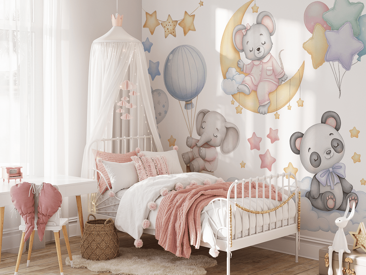 Sukurkite ramybės ir švelnumo atmosferą savo vaiko kambaryje su fototapetu „Mieguistai gyvūnai“. Šioje unikalioje iliustracijoje pavaizduoti žavingi, miegantys gyvūnai – pelė ant mėnulio, dramblys balione ir meškiukas ant debesies – apsupti pastelinių žvaigždžių, balionų ir minkštų debesų. Subtilios spalvos ir draugiški personažai sukuria harmoningą, raminančią erdvę, puikiai tinkančią poilsiui ir svajonėms.