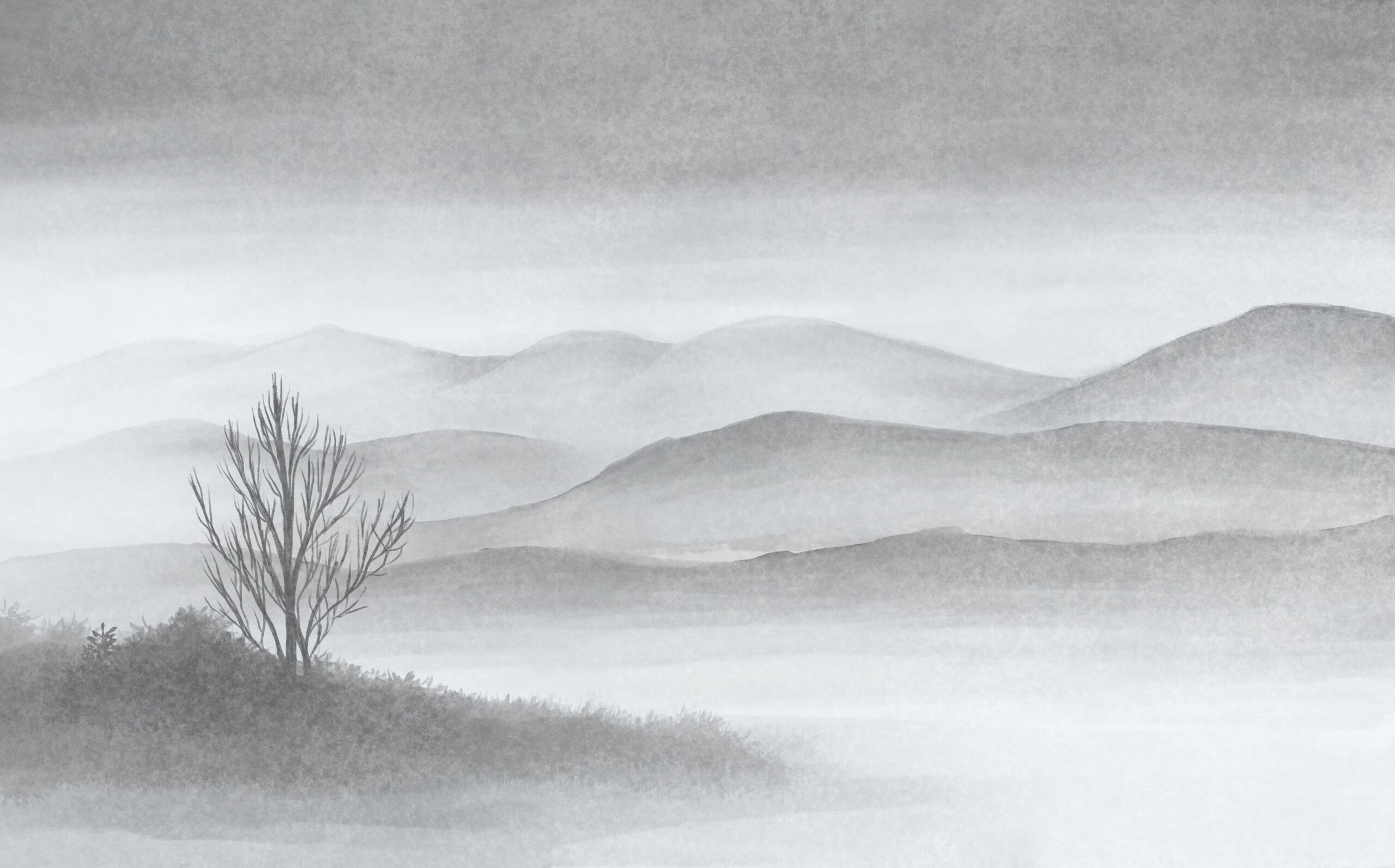 Sukurkite ramybės ir tylos atmosferą savo interjere su fototapetu „Miglanuotas horizontas“. Šis atmosferinis pilkų atspalvių peizažas vaizduoja švelnias kalvas, pasislėpusias ryto rūke, ir vienišą medį, sukurdamas itin harmoningą ir raminančią kompoziciją.