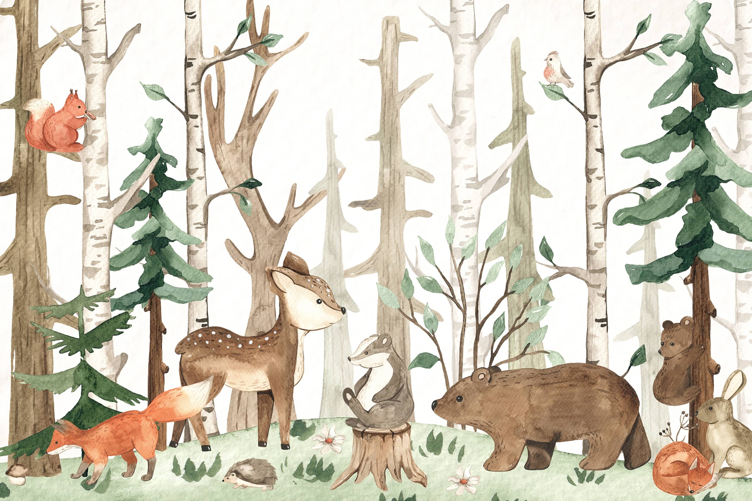 Nukelkite savo vaiką į magišką miško pasaulį su fototapetu „Miško rinkinys“. Šis unikalus akvarelės raštas vaizduoja ramų mišką, pilną draugiškų gyvūnų – nuo voverių, lapių, elnių, ežių iki meškų ir zuikučio. Subtilios spalvos, švelnios linijos ir draugiški personažai sukuria šiltą ir jaukią atmosferą, skatinančią ramybę ir vaizduotės vystymąsi.