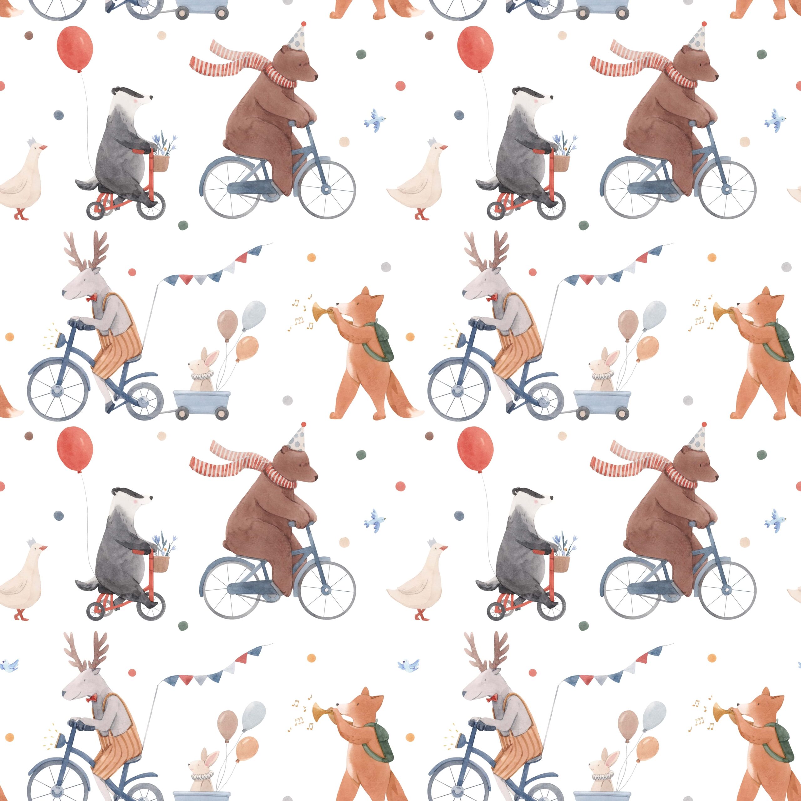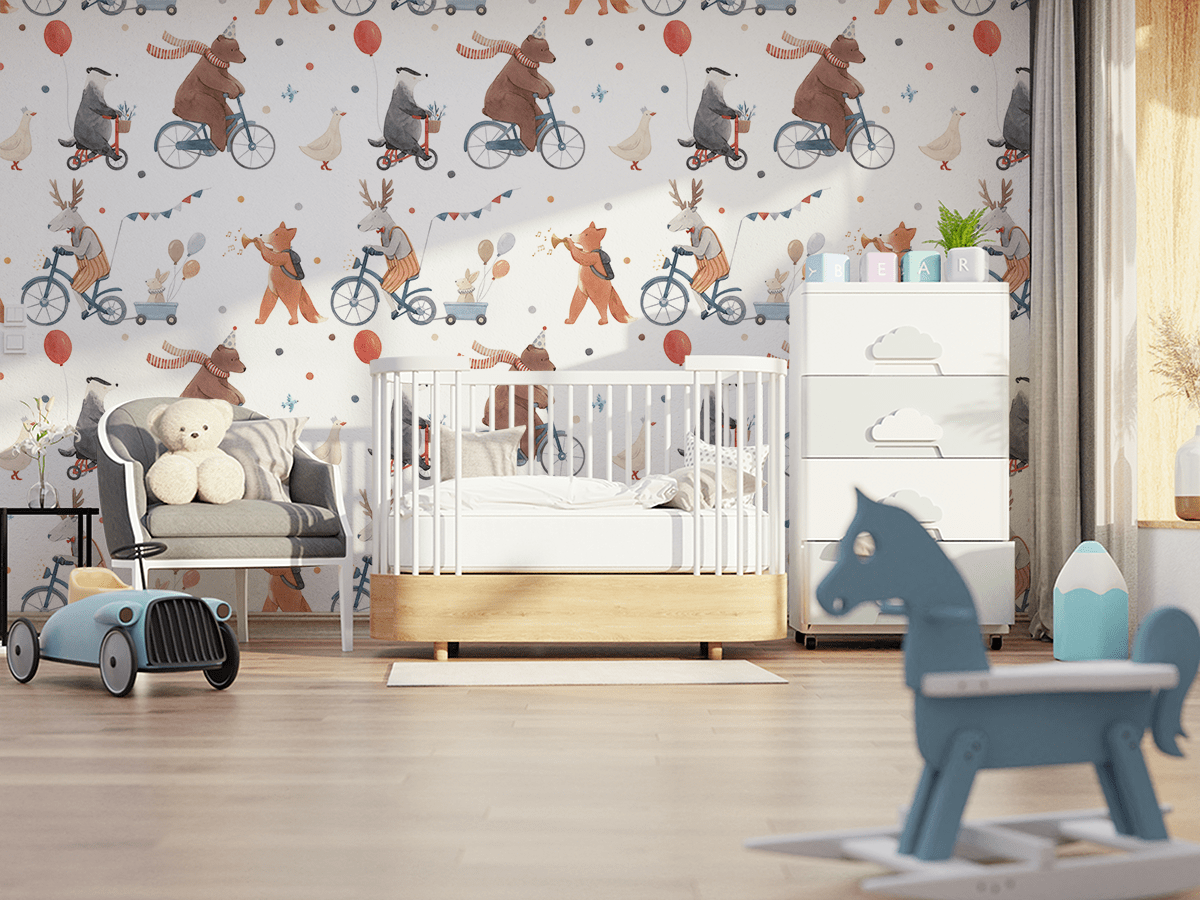 Paverskite savo vaiko kambarį stebuklinga vieta su fototapetu „Miško paradas“. Šis žavus raštas vaizduoja džiaugsmingus miško draugus – meškiuką, lapę, elnią, barsuką ir triušį – linksmai leidžiančius laiką kartu su dviračiais, paspirtukais ir muzikos ritmu. Subtilios, akvarelės spalvos ir draugiški personažai suteikia interjerui šilumos, džiaugsmo ir nerūpestingų nuotykių atmosferą.