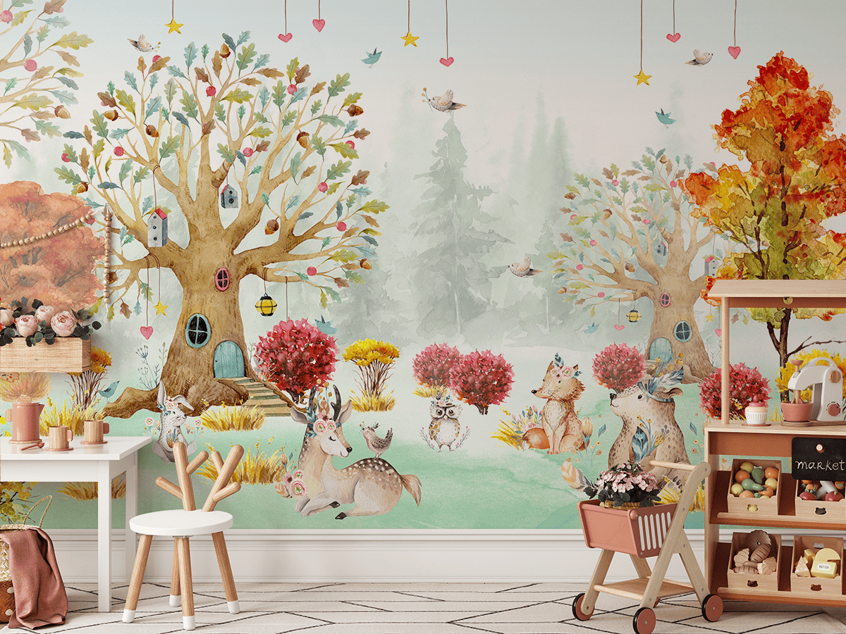 Fototapetas „Pasakų gyvūnų giraitė“ – magiškas draugystės, spalvų ir vaiko vaizduotės pasaulis