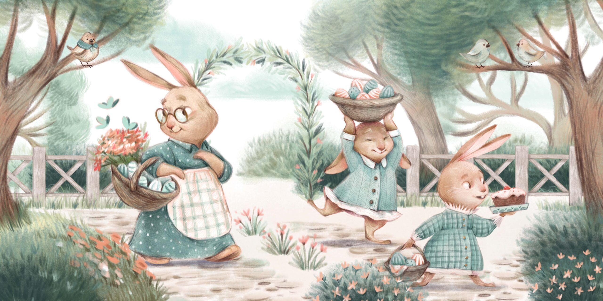 Fototapetas „Pavasario zuikiai“ – džiaugsmingos linksmybės, pavasario atmosfera ir žavinga vaiko kambario puošmena