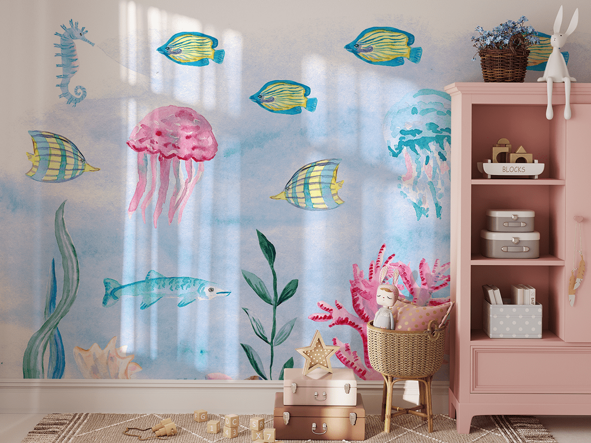Fototapetas „Povandeninė simfonija“ – spalvingas nuotykis, jūrinė fantazija ir pasakų pasaulis vaiko interjere