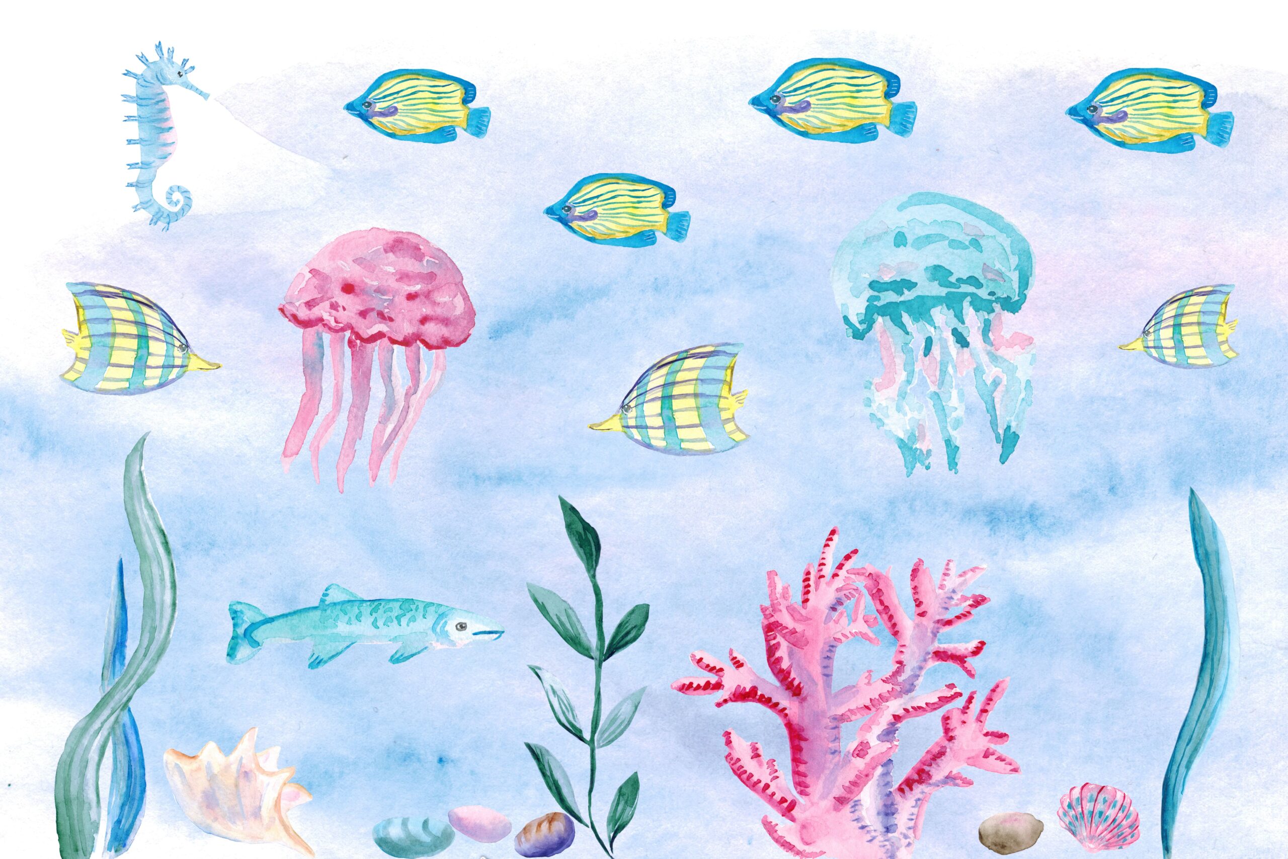 Pasinerk į magišką vandenyno pasaulį su fototapetu „Povandeninė simfonija“! Ši spalvinga, rankomis tapyta iliustracija nukelia mažiausiuosius į povandeninę šalį, pilną linksmų žuvų, medūzų, jūrų arkliukų ir koralų. Subtilūs akvarelės tonai ir žavūs jūros gyvūnai skatina vaizduotę ir suteikia nerūpestingų jūros nuotykių atmosferą vaiko kambariui.