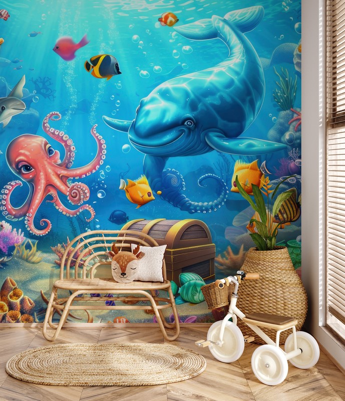 Įneškite spalvingą vandenyno pasaulį į savo vaiko interjerą su fototapetu „Povandeninis nuotykis su jūros gyventojais“. Šioje žavingoje, spalvingoje kompozicijoje pavaizduoti besišypsantys delfinai, žaismingos žuvys, draugiškas ryklys ir mielas aštuonkojis, sukuriant pasakišką peizažą, kuriame knibžda povandeninė gyvybė. Kiekviena detalė – nuo spindinčių koralų iki dugne paslėpto lobio – lavina vaikų vaizduotę ir skatina juos atrasti pasaulį.