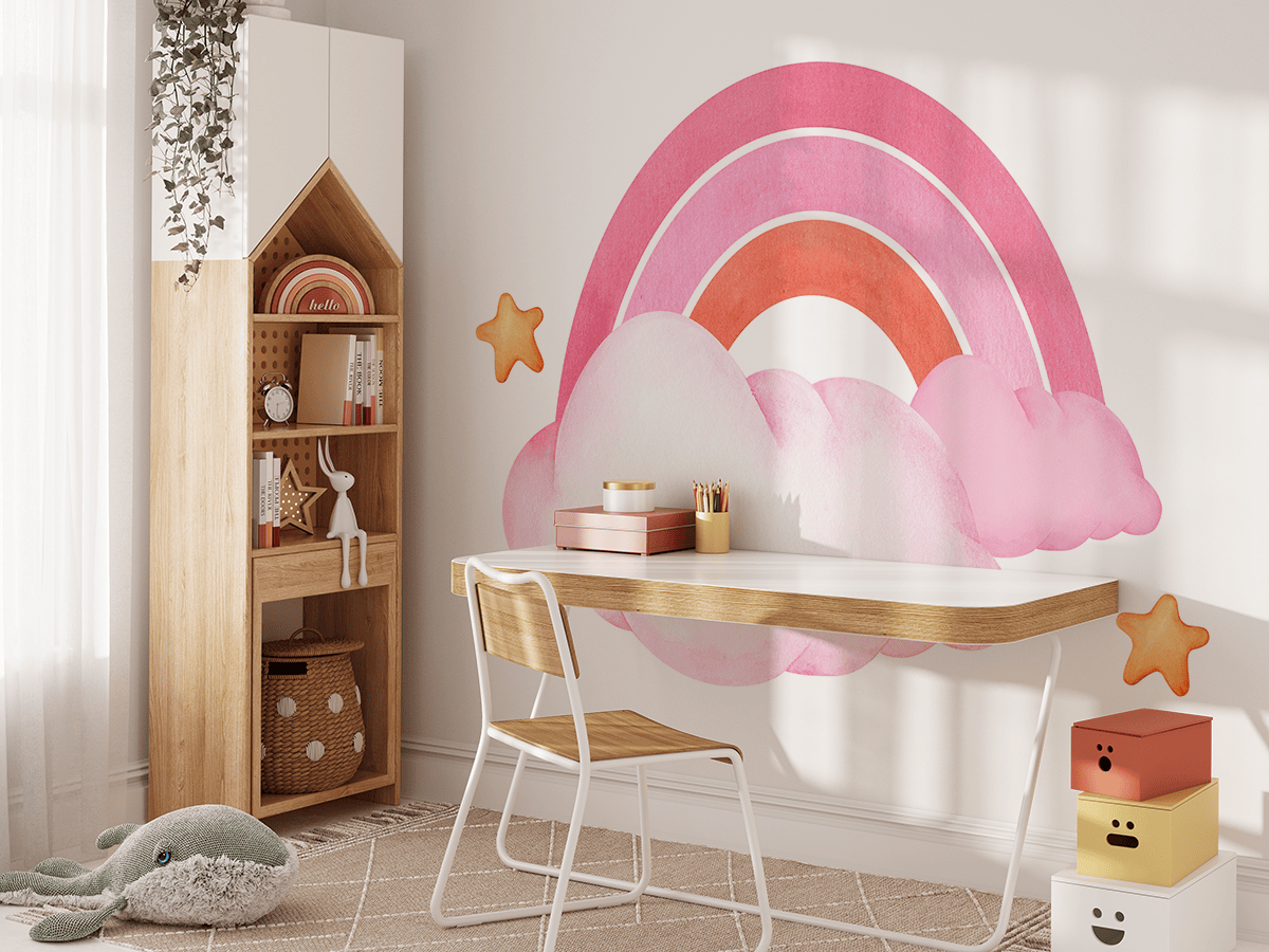 Fototapetas „Rožinė svajonių šalis“ – pastelinių debesų švelnumas, rožinės vaivorykštės žavesys ir magiškos žvaigždės sukuria šilumos ir vaizduotės kupiną vaiko pasaulį.