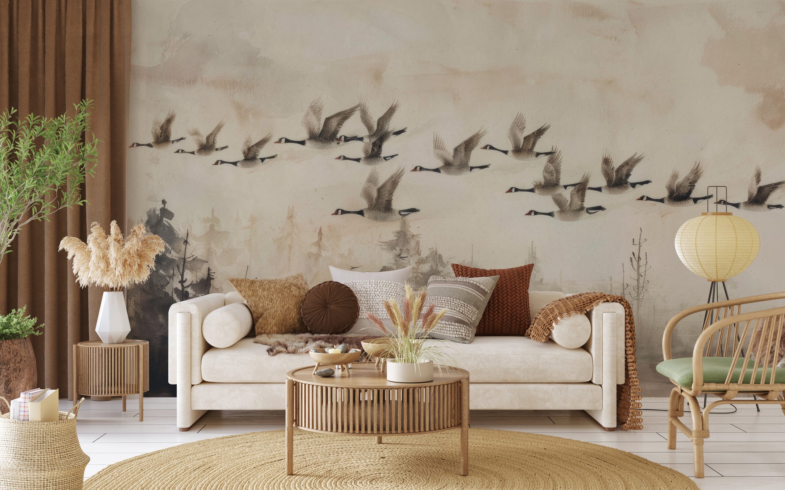 Sukurkite unikalią ir nepakartojamą atmosferą savo interjerui su fototapetu „Skrydis“. Subtilus žąsų, skrendančių virš migloto miško, motyvas yra ne tik graži dekoracija, bet ir laisvės, ramybės bei natūralios pusiausvyros simbolis. Šis subtilus raštas derina gamtos estetiką su minimalistiniu stiliumi, sukurdamas gaivumo ir švelnumo kupiną erdvę. Subtilios spalvos ir švelnios, neryškios detalės leidžia šiems fototapetams harmoningai įsilieti tiek į modernų, tiek į klasikinį interjerą, praturtindamos jį subtiliu, menišku akcentu.