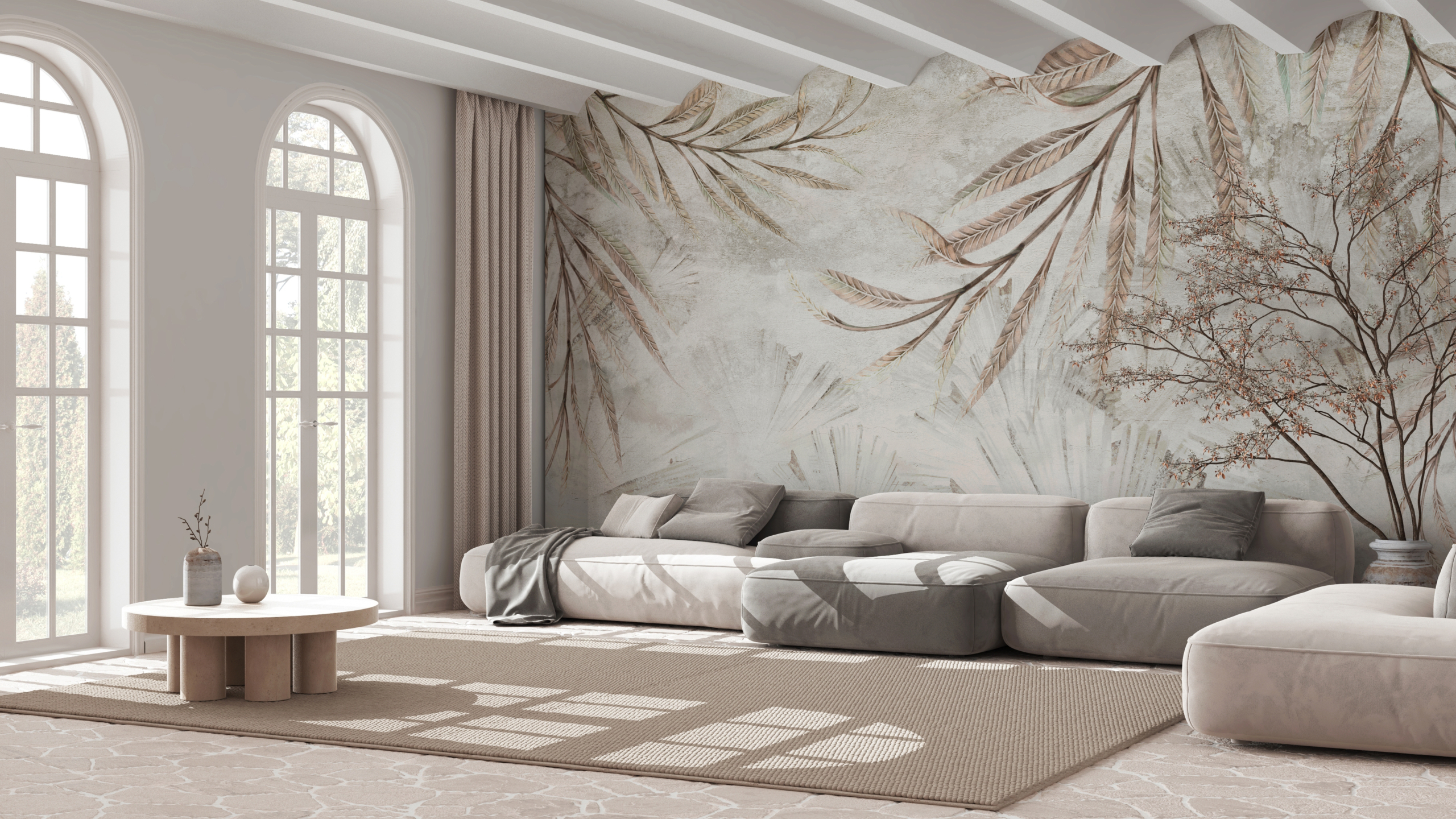 - ATOGRĄŽŲ LAPAI, BIURUI, Fototapetai, GAMTA, GĖLĖS, Kambariui, PRIEŠKAMBARIUI, SALONUI, Boho, Pilkos spalvos atspalviai, Spalvos, Stilius
