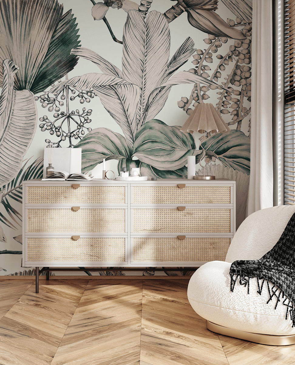 Pagyvinkite savo interjerą fototapetu „Tropical Sonata“. Šis įmantriai sukurtas raštas, įkvėptas tropinės floros, derina iliustratyvų tikslumą su menišku lengvumu. Subtilus pastelinių atspalvių paletė ir harmoninga egzotiškų lapų bei gėlių kompozicija suteikia erdvei ramybės, gaivumo ir rafinuoto stiliaus atmosferą.