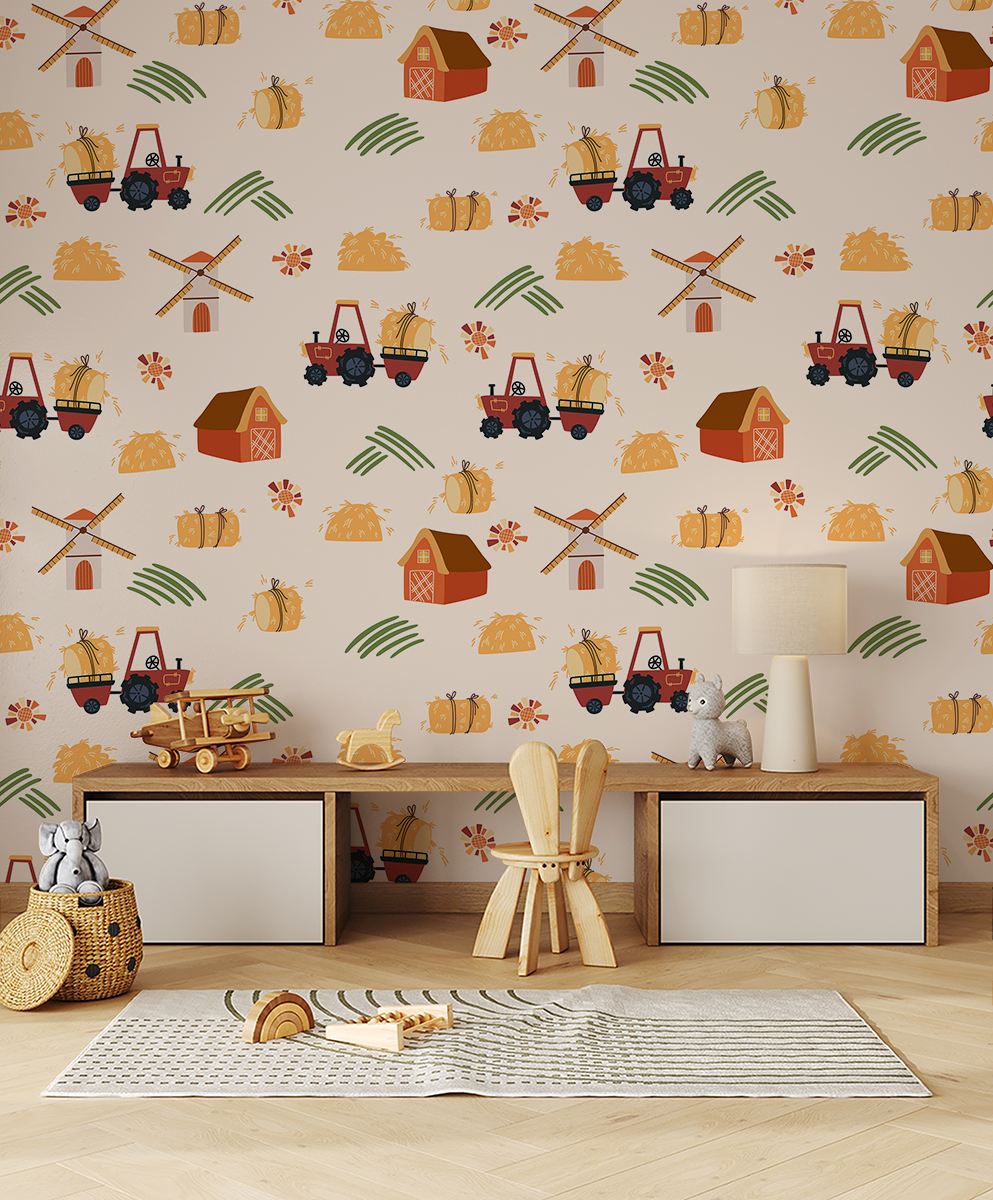 Persikelkite į ramų kasdienio kaimo gyvenimą su fototapetu „Ūkio harmonija“. Šis žavus raštas su traktorių, malūnų, tvartų ir šieno kupetų motyvais sukuria šiltą, draugišką atmosferą, kupiną natūralios harmonijos ir paprastumo. Subtilios, šiltos spalvos suteikia ramybės ir pusiausvyros, idealiai tinka sukurti erdvę, skatinančią atsipalaidavimą ir ramybę.