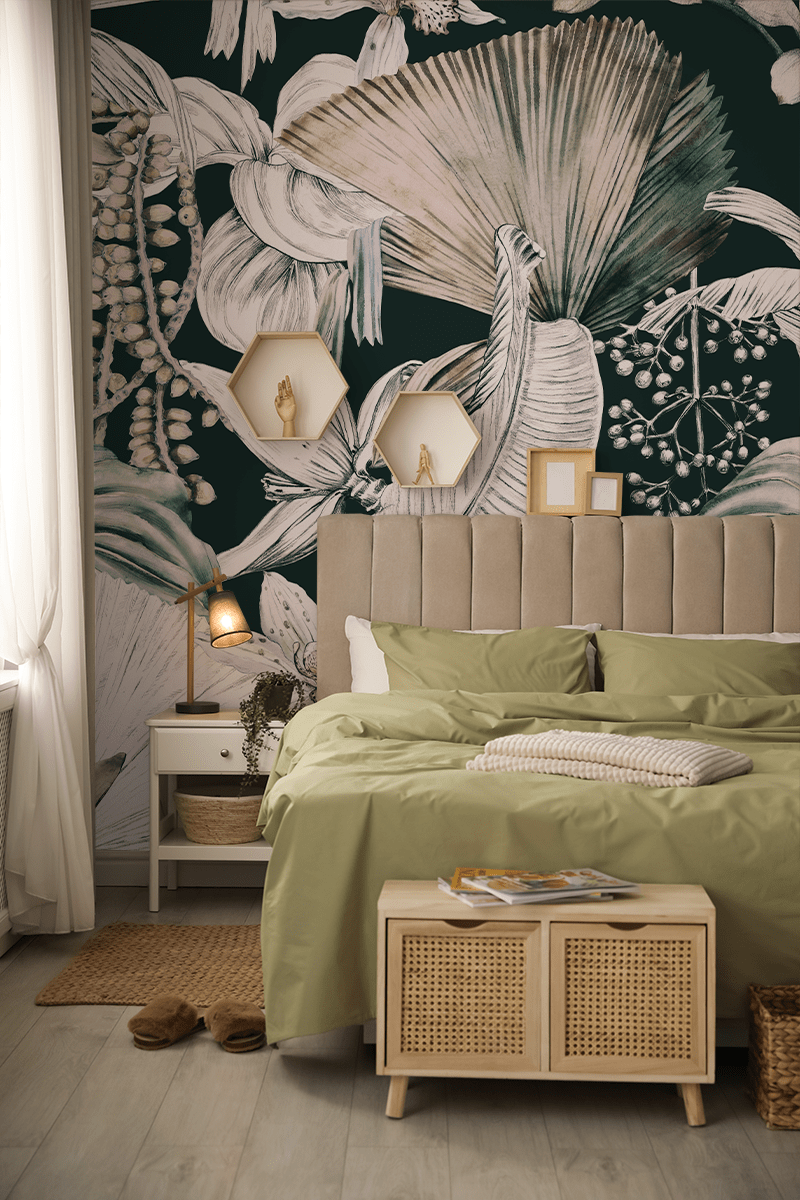 - 3D, ATOGRĄŽŲ LAPAI, Fototapetai, GAMTA, Kambariui, MIEGAMAJAM, SALONUI, VIRTUVEI, Atogrąžų, Spalvos, Stilius, Žalios spalvos atspalviai