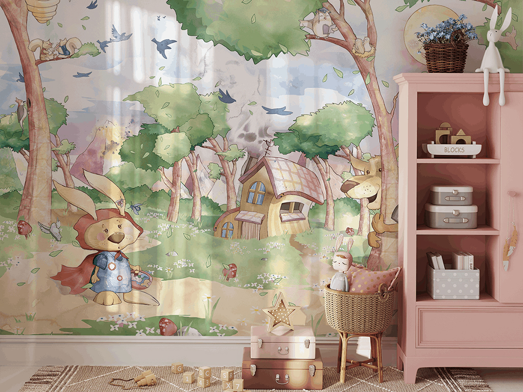 Zuikis Raudonkepuraitės vaidmenyje – pasakų tematikos fototapetas su nostalgijos prieskoniu