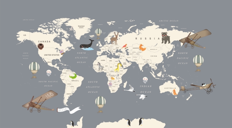 Vaikų kambario siena neturėtų būti nuobodi. Dažymas dažais nėra geriausias sprendimas. Kita vertus, siūloma sieninė tapyba su pasaulio žemėlapio motyvu puikiai tiks. Žemynų kontūrai buvo paįvairinti skirtingais elementais. Žemėlapyje, be kita ko, buvo banginis, lėktuvai ir lapė. Dėl to sieninė tapyba tampa patrauklesnė vaikams. Puikiai tinka ir berniukams, ir mergaitėms. Jį galima sėkmingai naudoti vaikų, kurie jau gerokai peržengė ikimokyklinio amžiaus ribas, kambario sienai įrengti.