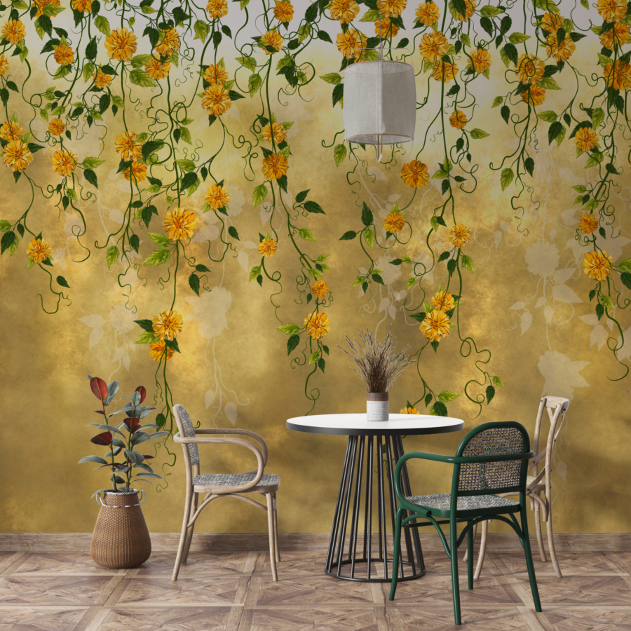 Auksinės gėlės geltoname fone sukurs jaukią ir šiltą atmosferą, kuri akimirksniu suteiks jūsų interjerui žavesio ir elegancijos. Dėl aukštos kokybės spaudos ir patvarių medžiagų sieninė tapyba atrodys nepriekaištingai daugelį metų.
