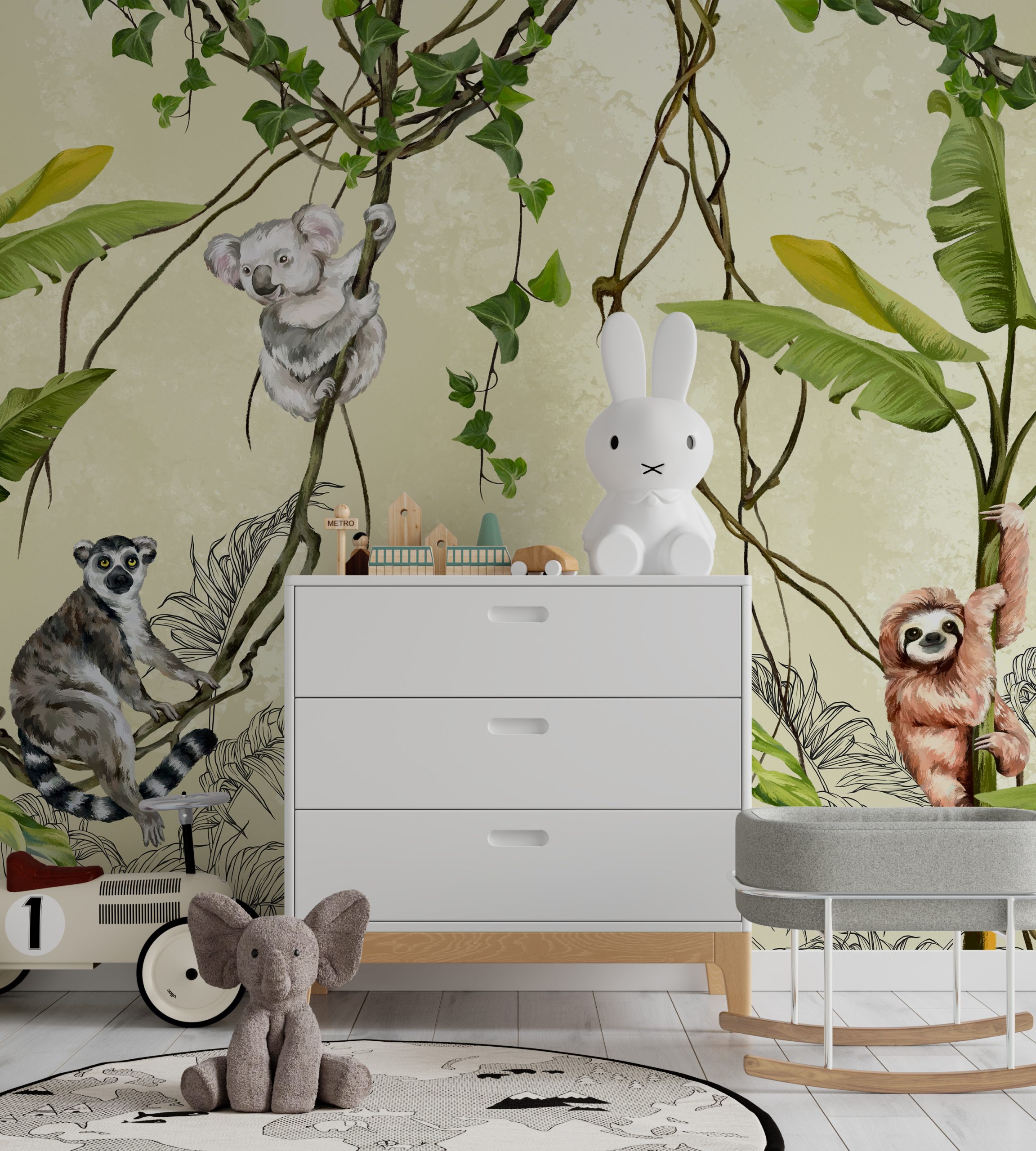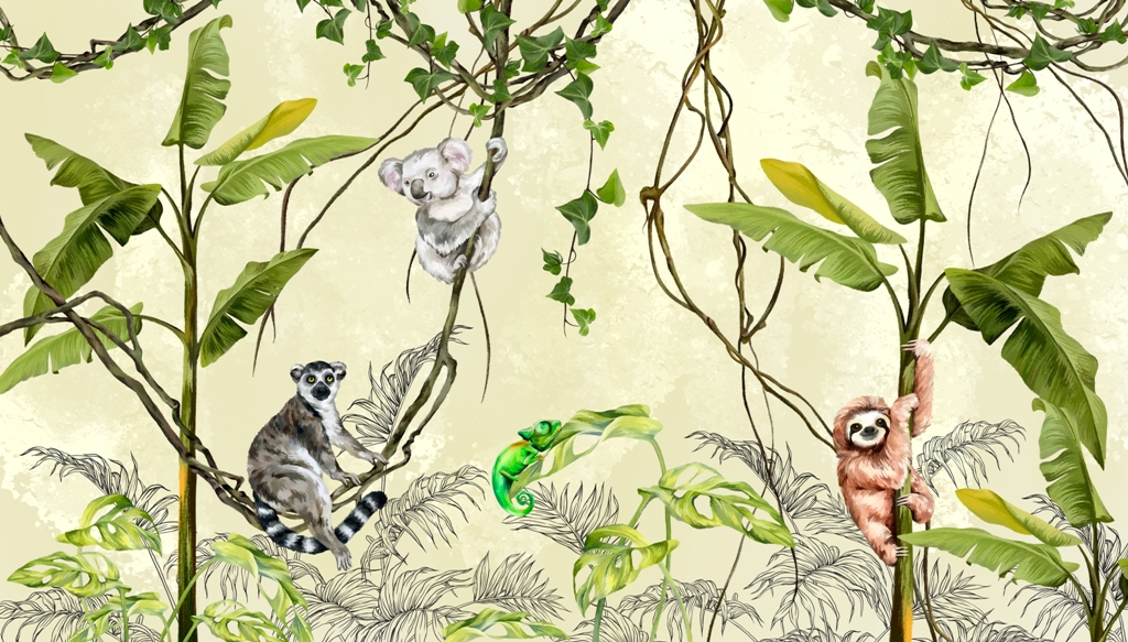 Persikelkite į atogrąžų džiungles su šia žavinga sienų tapyba, vaizduojančia gyvūnus ant lianų. Puikus būdas sukurti egzotišką atmosferą savo namuose!