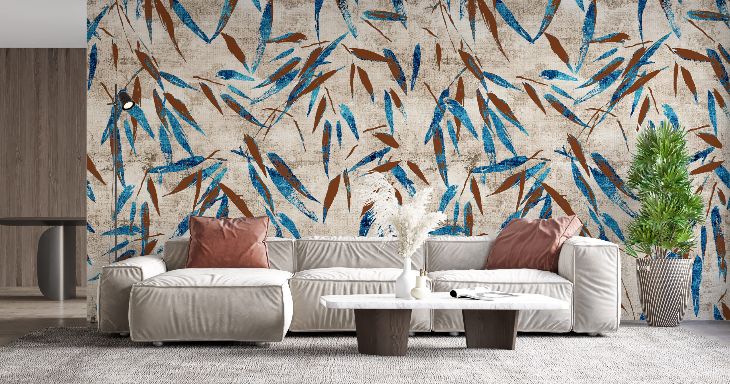 Šioje žavingoje sieninėje tapetoje vaizduojami švelnūs mėlyni ir rudi lapai, kurie suteiks jūsų interjerui subtilią ir malonią išvaizdą. Šie lapai išdėstyti harmoningu raštu, todėl visa tai atrodo labai elegantiškai ir natūraliai.