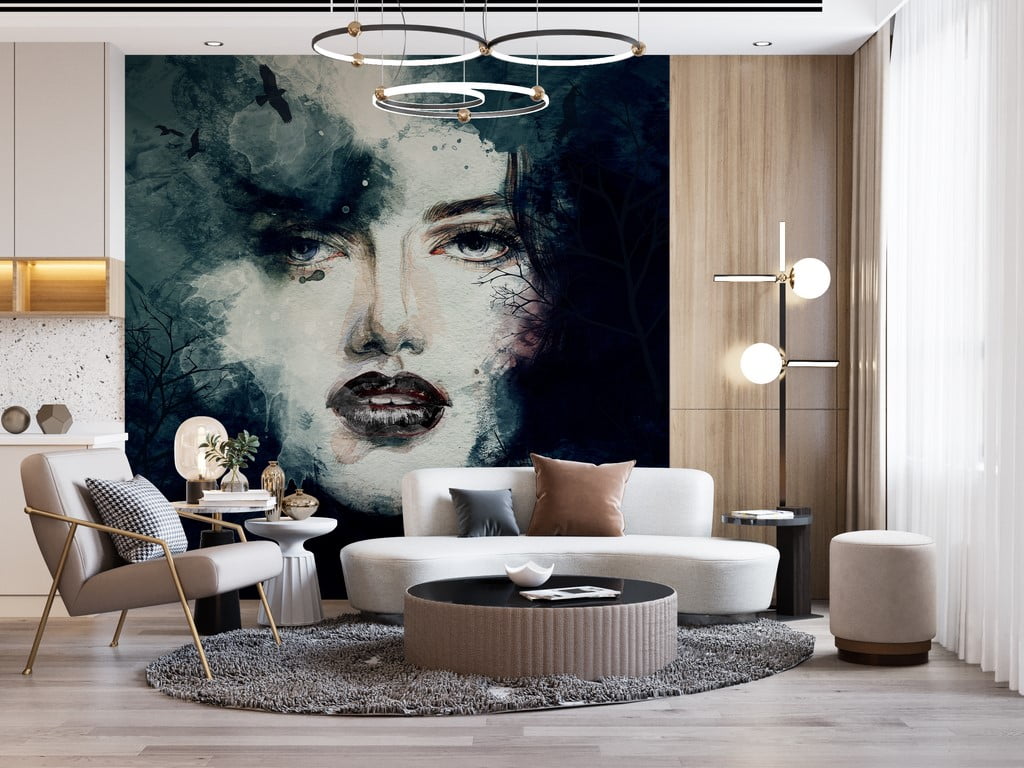 Įdomi ir akį traukianti sienų tapyba su menišku moters veido ir paukščių atvaizdu tikrai paįvairins bet kokį interjerą. Atmosferiška ir itin kruopščiai pagaminta, ji gali tapti išskirtiniu bet kurio kambario elementu. Tamsią fono spalvą perskrodžia balta nutapyto veido spalva, todėl visas darbas traukia akį. Ši sieninė tapyba gali tapti stipriu ir drąsiu kambario akcentu. Verta jį kruopščiai parinkti, kad derėtų prie interjero ir būtų pasiektas geriausias įmanomas efektas.