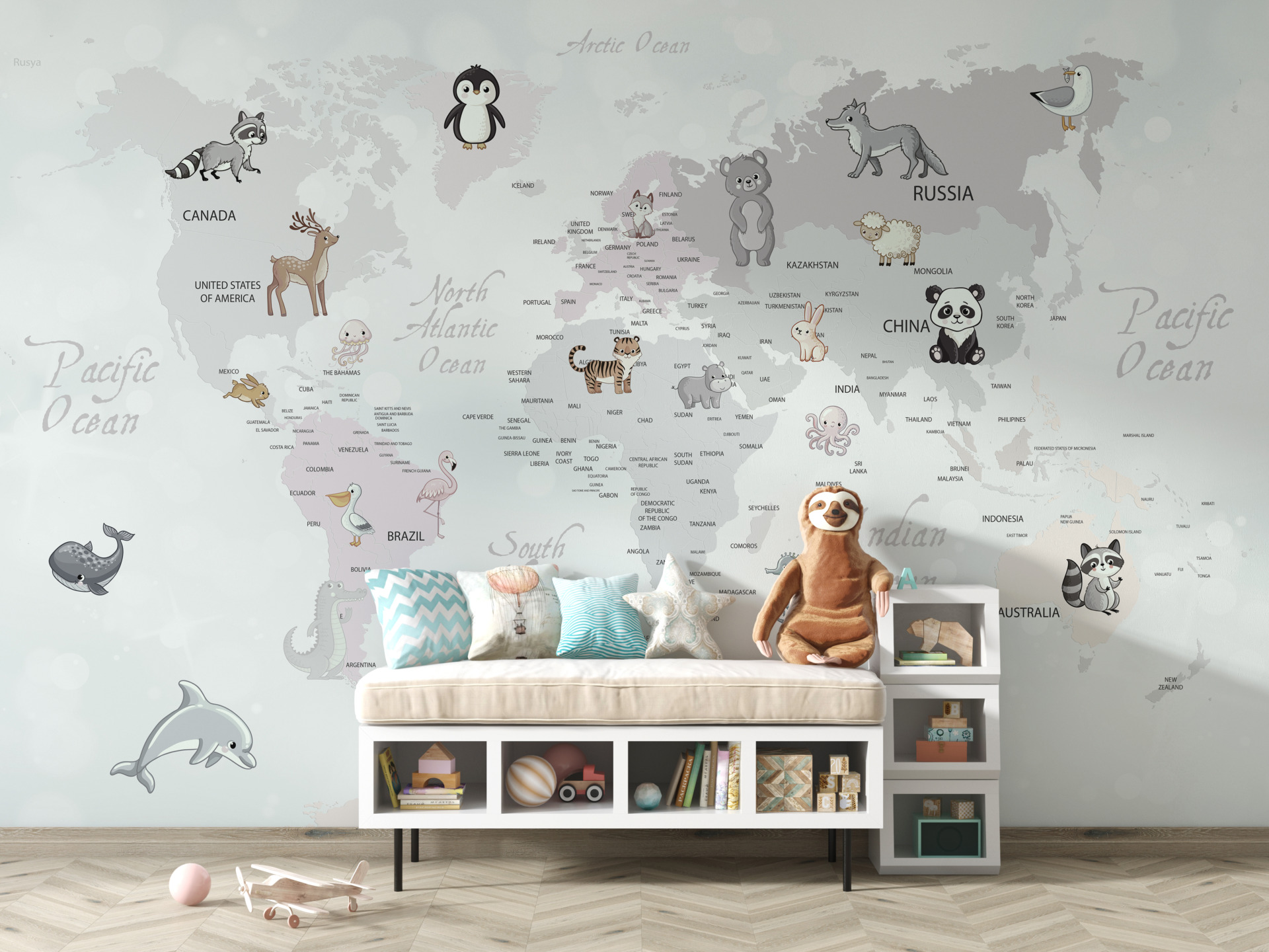 Ši graži sieninė tapyba – puikus būdas suteikti bet kuriam kambariui spalvų ir charakterio. Jame vaizduojamas pasaulio žemėlapis su įvairiais gyvūnais iš viso pasaulio.