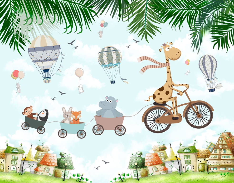 Vaiko kambario sienos turėtų būti apdailintos taip, kad būtų patrauklios vaikui. Geras pasirinkimas – siūloma sieninė tapyba, kuri yra visiškai saugi mažyliams. Vaizduojamas dangumi sklendžiantis traukinys, kuriam vadovauja dviračiu važiuojanti žirafa. Be kita ko, vagonuose galima pamatyti besišypsantį hipopotamą ir patenkintą beždžionę. Freska skirta ir mergaitėms, ir berniukams. Linksmos spalvos sukurs puikią nuotaiką bet kuriame vaiko kambaryje.